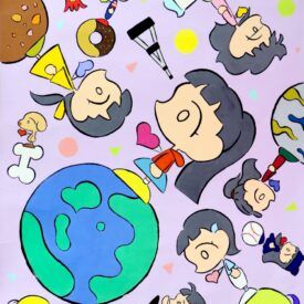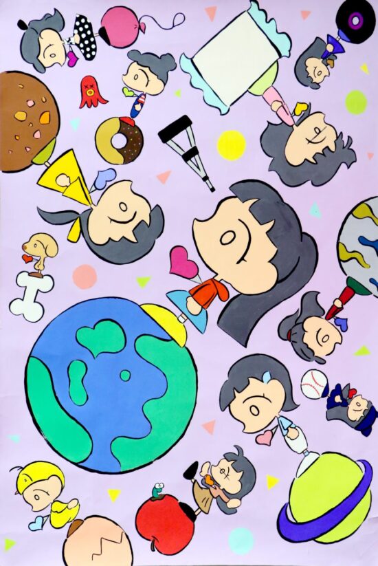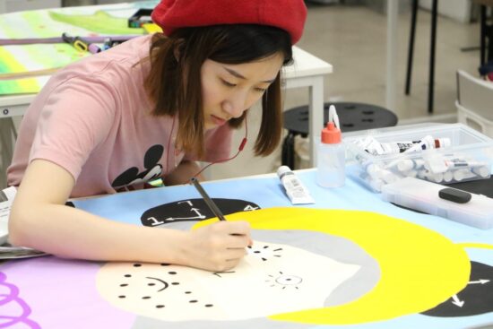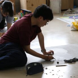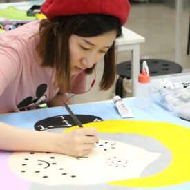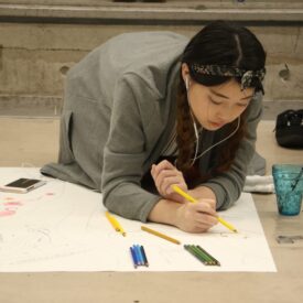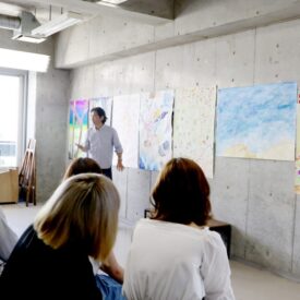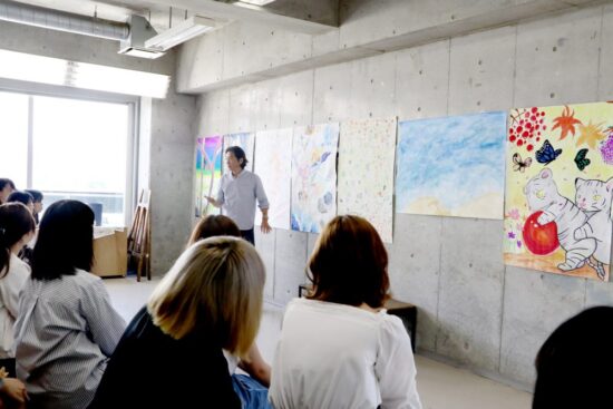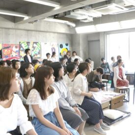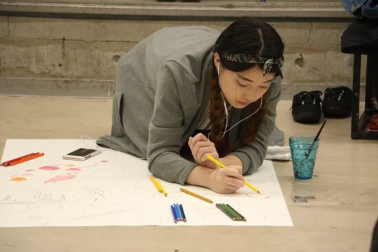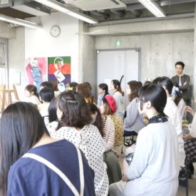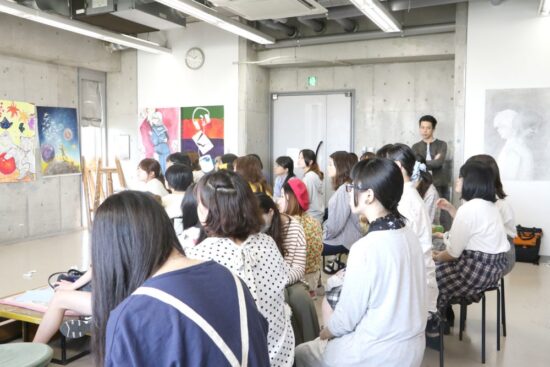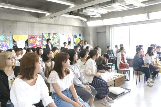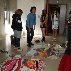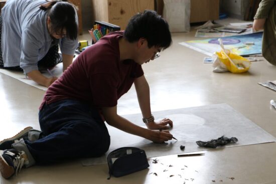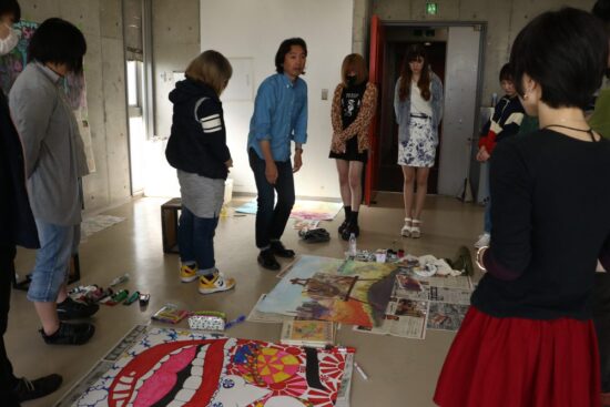 飯田淳先生による1年生5つの力「色彩力」の授業です。 色彩力では柔らかな発想のもと、物や事、 ストーリーを色で表現する授業です。決めつけで物を作らず、 固定概念に囚われない事。意外性のある課題を通して 「自分の枠」を飛び越え、 個性が重視されるイラストの世界に近づくための授業です。 今回は自分の体が乗せられるほど大きな紙 “自分自身”を自由に描画する課題でした。