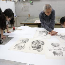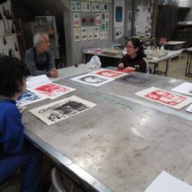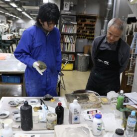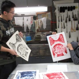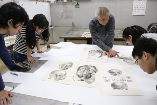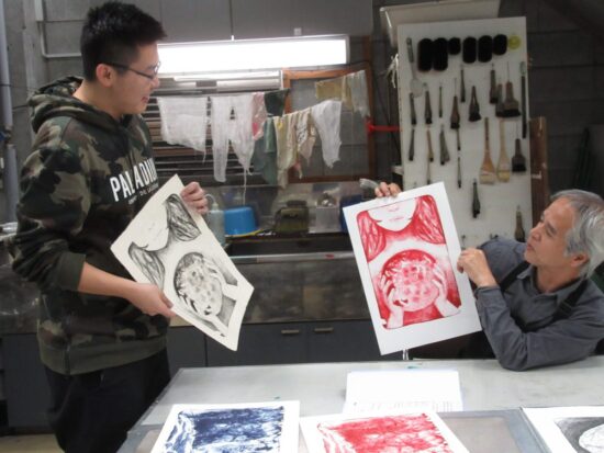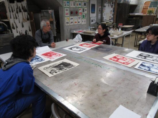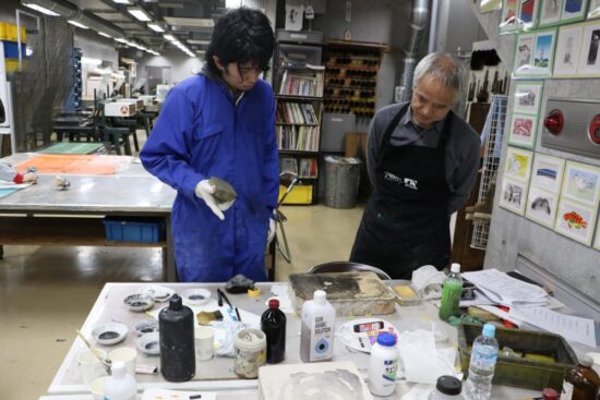 2年生 版画専攻「石版画」板津悟先生による2年版画専攻「石版画」の授業です。 講義、実習を通して石版画の歴史や技術を学び、平版の仕組みを体感しながら石版石の特徴を活かした制作を行います。石版石を版材として使える様な状態にするまでの作業工程も含めて、素材との対話を大切にしながら個々の表現を考えていきます。作品はモノトーンとし、一つ一つの行程を把握していきます。