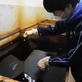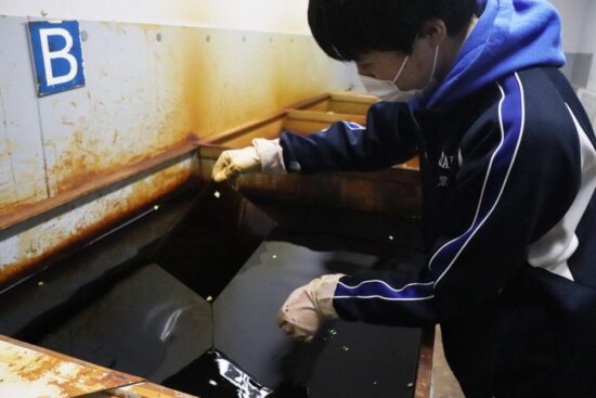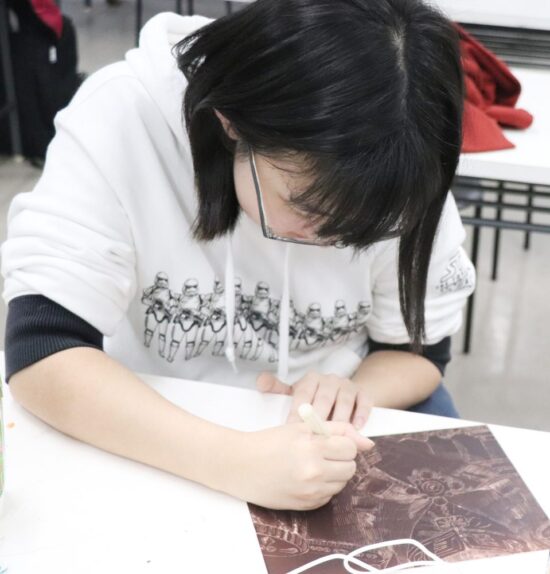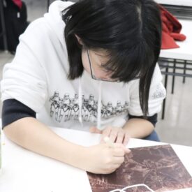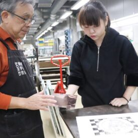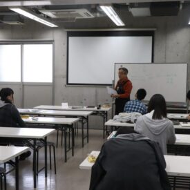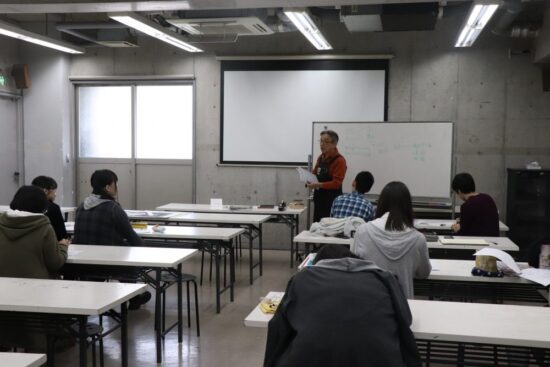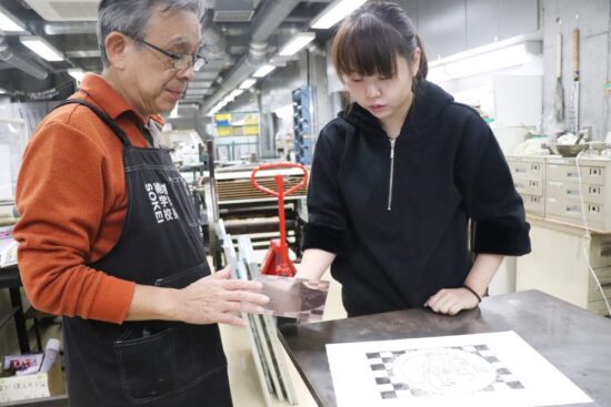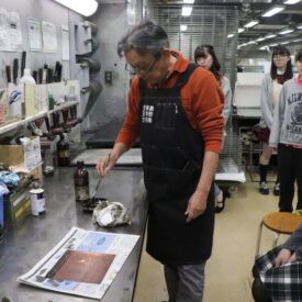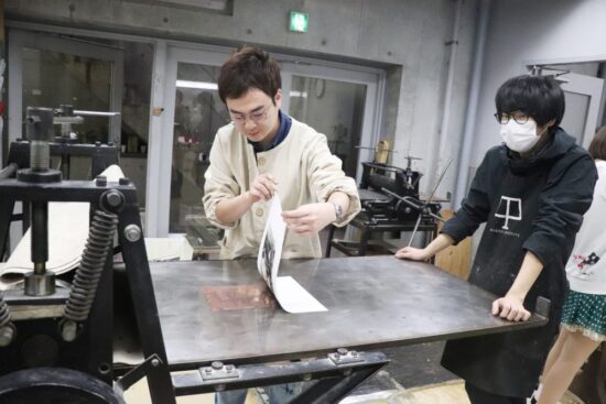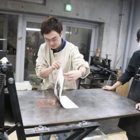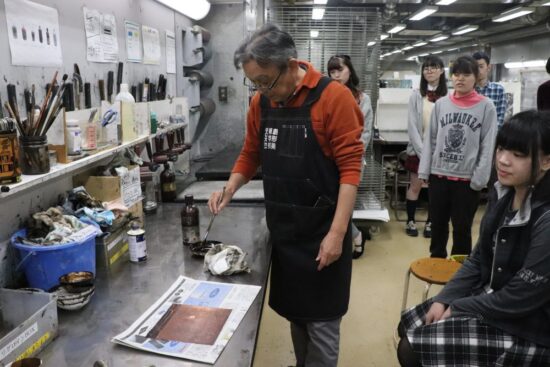 大沼正昭先生による1年生「銅版画1」の授業です。 版上に凹状のくぼみを作り凹部にインクを詰め刷りとる技法です。凹部を作る方法として、酸による腐食と直に刷り込む方法とがあります。凹部の深さによって黒の諧調が得られます。版を通して個々の表現の可能性を考えます。様々な技法を紹介し、版表現の可能性を探ります。