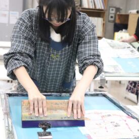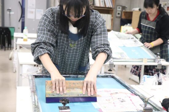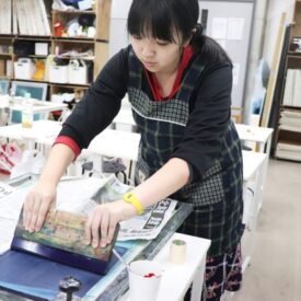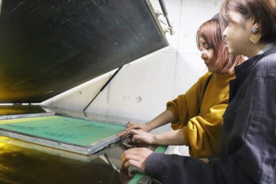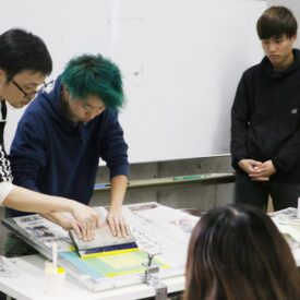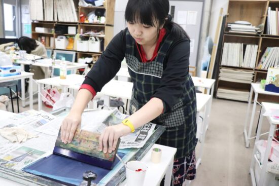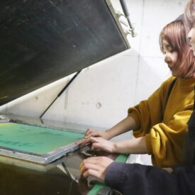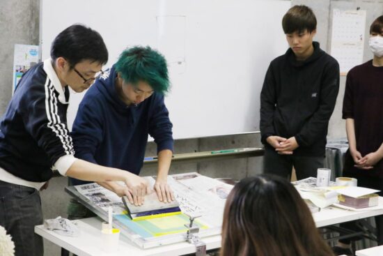 東樋口徹先生による1年生「シルクスクリーン1」の授業です。 シルクスクリーンは別名孔版と呼ばれ、型染めの型紙と紗が組み合わされて改良されたものです。枠に張った紗の目を不十分な部分は塞ぎ、画の孔(穴)の部分からスキージによって下の紙にインクを落として刷る技法です。授業においてはいくつかの製版方法がありますが、現在一般的に行われる直接感光法を学びます。基礎を身に付け各自のイメージに近づける作品作りを目指します。