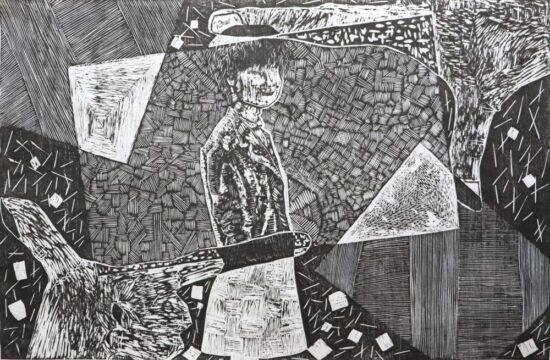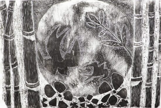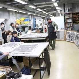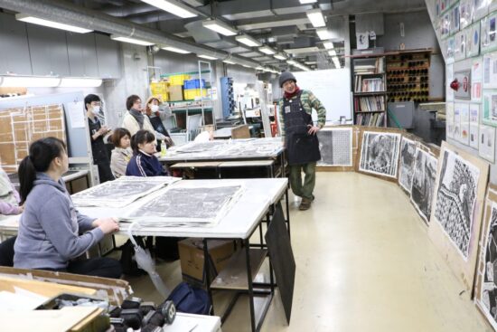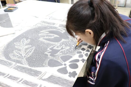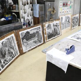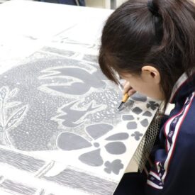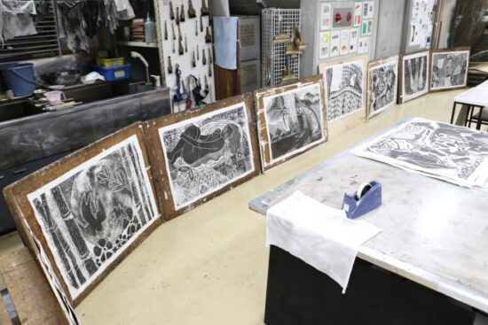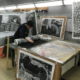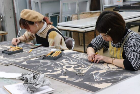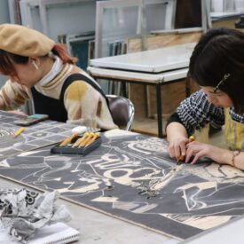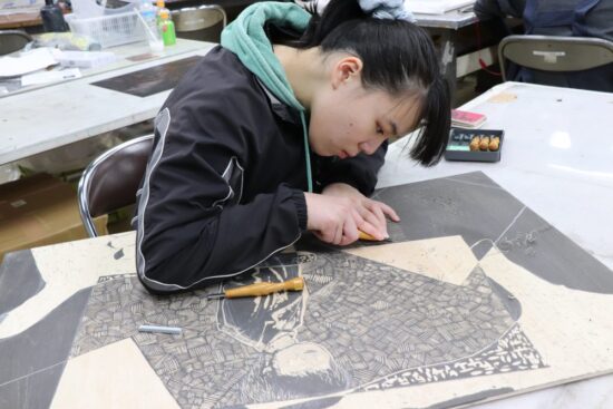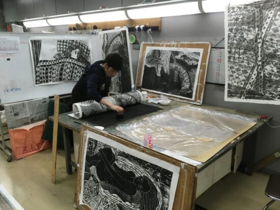 1年生 版画専攻「専攻別実技テーマ制作」鈴木吐志哉先生による1年生版画専攻「専攻別実技テーマ制作」の授業です。 水性木版画1版単色(墨摺り) 版木サイズ 900×600㎜で作品を制作します。 水性木版画の基本技術の習得目指します。 |