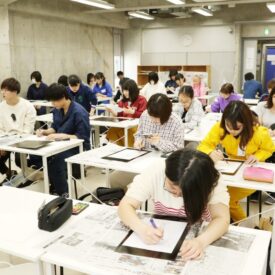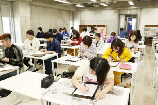 鈴木吐志哉先生による1年生 ファインアート科 「技法力」の授業です。 技法力は、いろいろな技法から生まれる表現を体験を通じて探る授業です。 フロッタージュから始まり、シルクスクリーン・コラージュ・マーブリング など手では描ききれない表現を学びます。そして自分の中の新たな可能性を 見つけていきます。