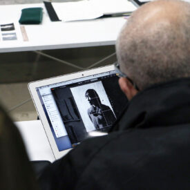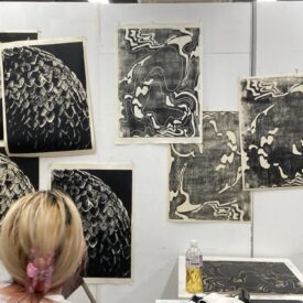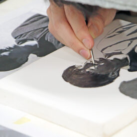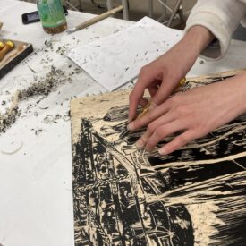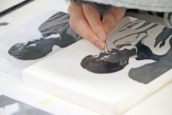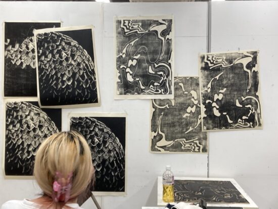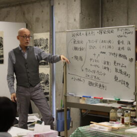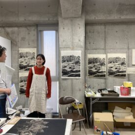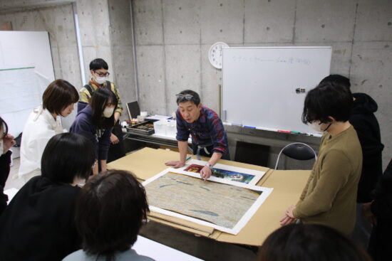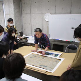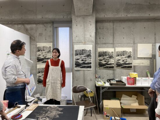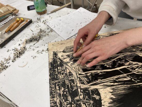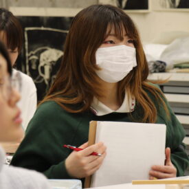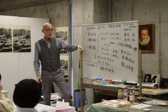 1年生「専攻別テーマ制作(版画専攻・絵画専攻)」鈴木吐志哉先生(前半)と工藤礼二郎先生(後半)による1年生 ○油性木版画1版単色。モノクロームの大型版木に取り組み制作することで、木版画油性摺り技法の基本と魅力を体験します。版木サイズ 600×450㎜ ○水性木版画の基本技術の習得を目的とする。 ○絵画を学ぶ上で重要な西洋絵画。その中心をなす油彩画の支持体の変遷を学ぶと同時に、油彩画発祥の初期フランドル派の技法に基づくグリザイユ(モノトーンの絵画)を制作する。 ○油彩画の古典技法を通じて油絵材料の性質や支持体の重要性と絵画組成を理解する。 |