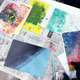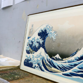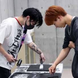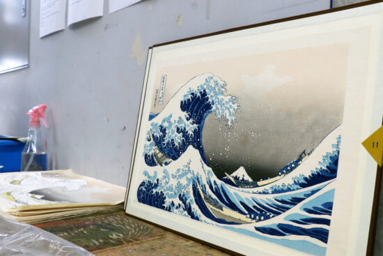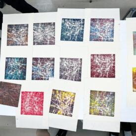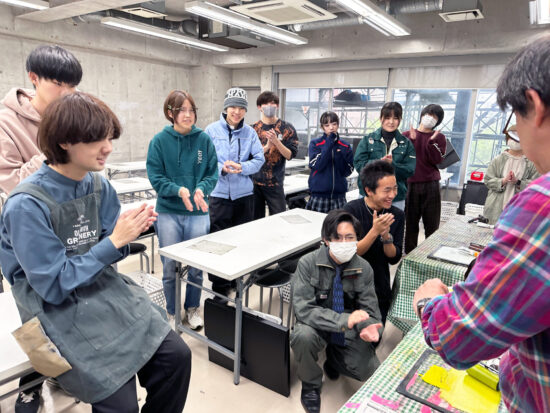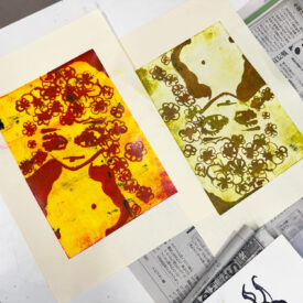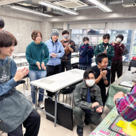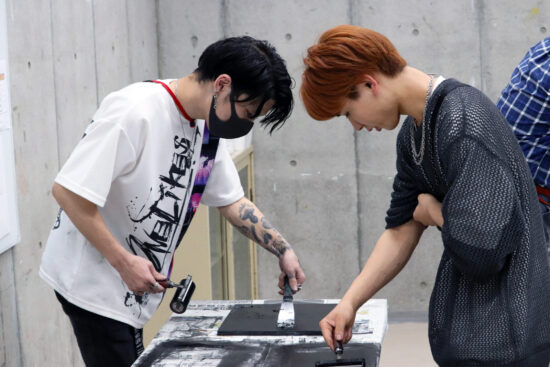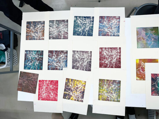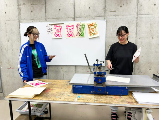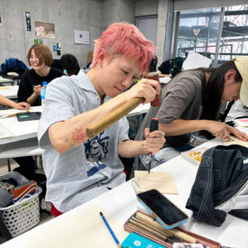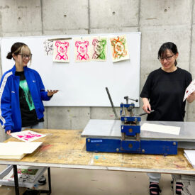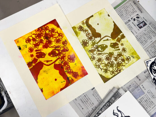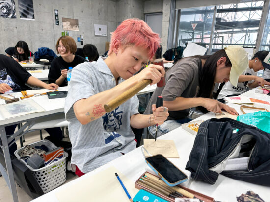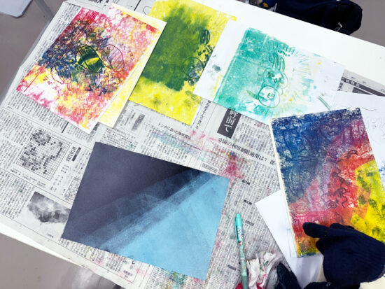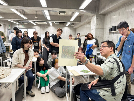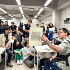 鈴木吐志哉先生による1年生「技法力」の授業です。 技法力は様々な版画の技法から生まれる表現を体験しながら探る授業です。まずフロッタージュから始まりモノタイプやシルクスクリーンなど、直接描くことでは得られない間接表現の魅力を学びます。さらに本校収蔵の葛飾北斎「神奈川沖浪裏」復刻版の版木をキーワードにして自由な表現による木版画、コラージュへと展開させてゆきます。版画というフィルターを通すことで、自分の作品の別の顔に出会うことを目標とします。