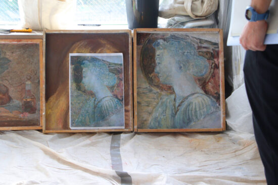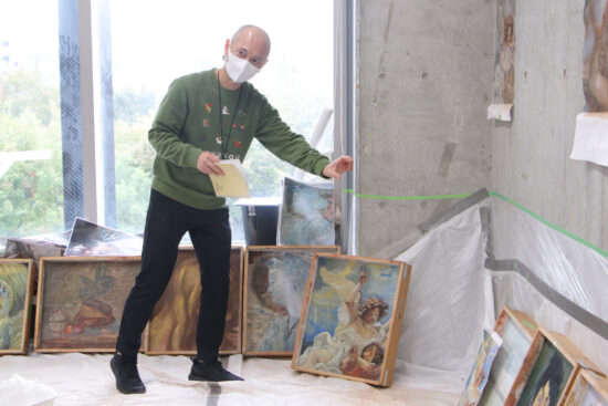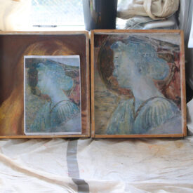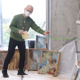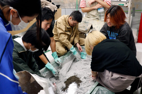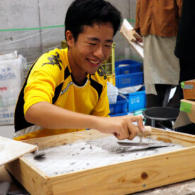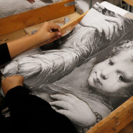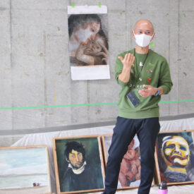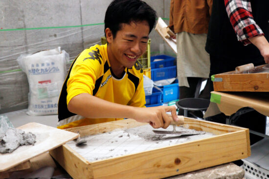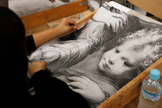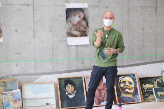 1年生ファインアート科「フレスコ画」杉崎匡史先生による1年生ファインアート科「フレスコ画」の授業です。 油彩画以前の一つの古典技法であるフレスコ画技法は、消石灰と砂を混ぜたもので漆喰壁を作り、その壁が乾き切らないうちに顔料を水のみで溶いて描ききるものです。 |