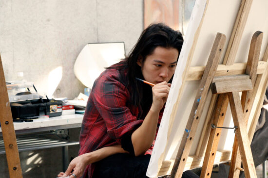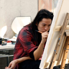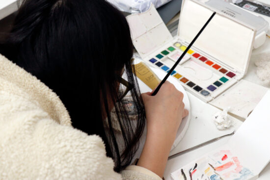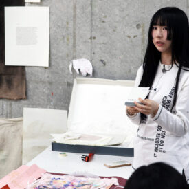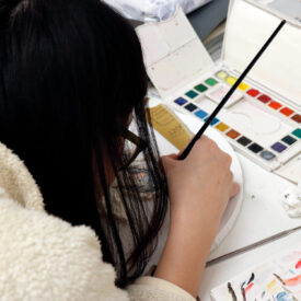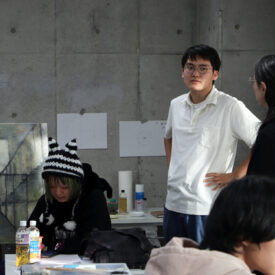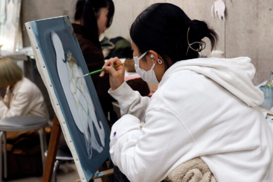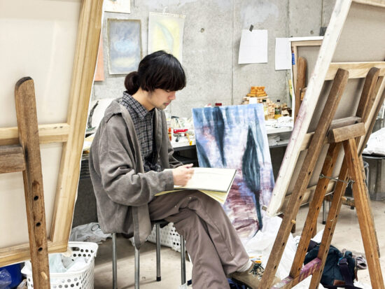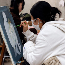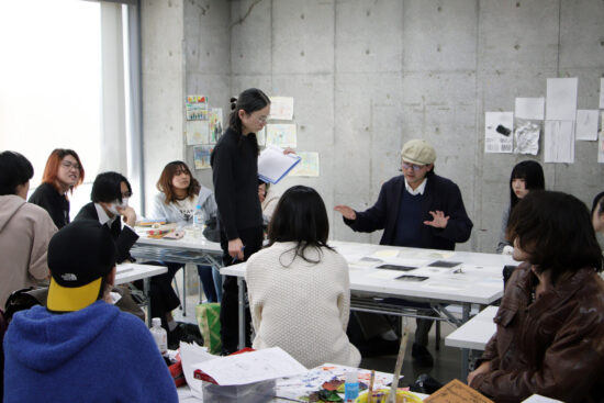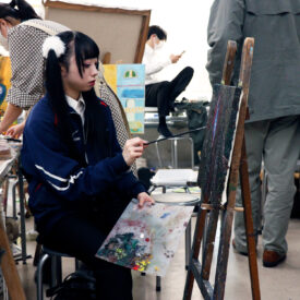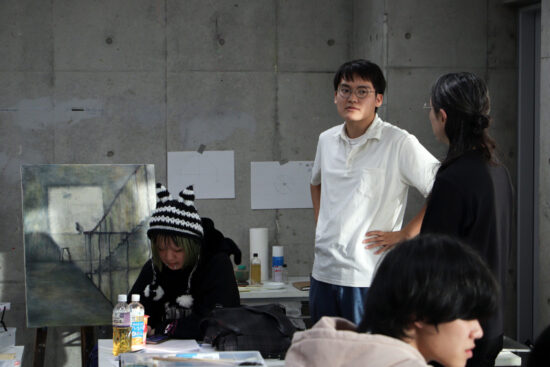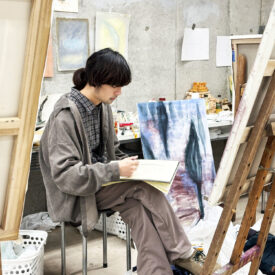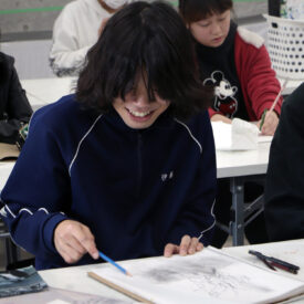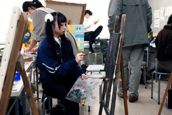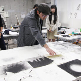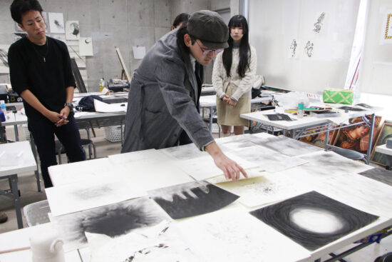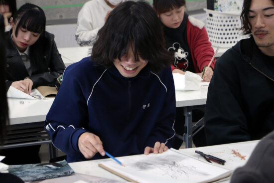 1年生ファインアート科「絵画表現」安藤孝浩先生による1年生ファインアート科「絵画表現」の授業です。 対になる言葉をイメージのヒントにして沢山のドローイングを描く。(例:「静と動」「熱い、冷たい」など) イメージドローイングをラフに沢山描く事で絵画制作を柔軟にとらえる思考を養う。 |