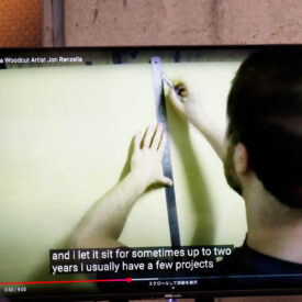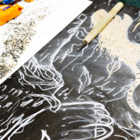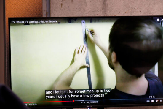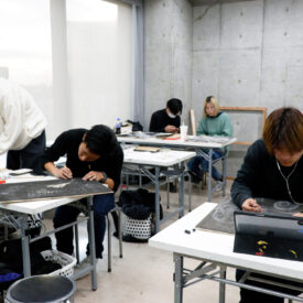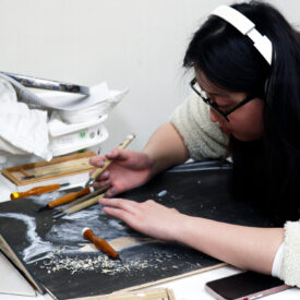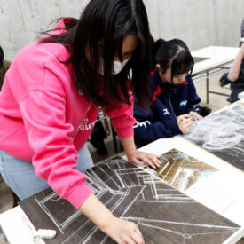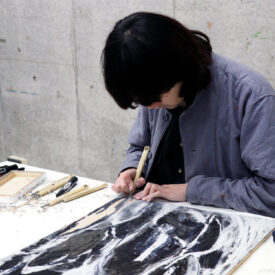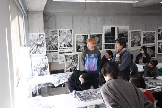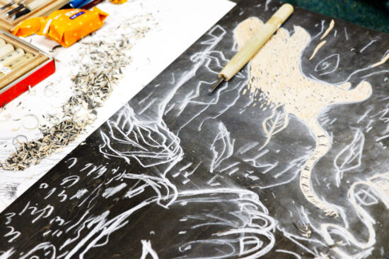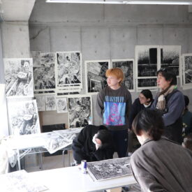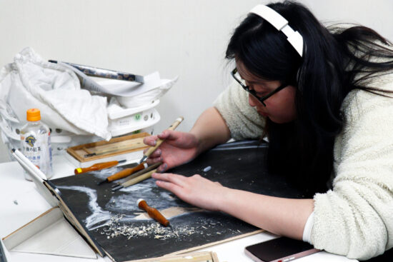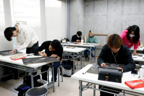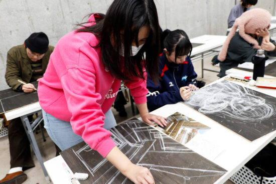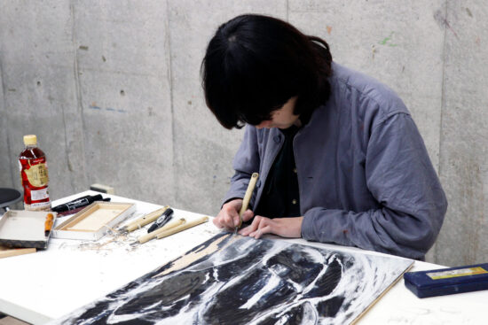 鈴木吐志哉先生(木版)と工藤礼二郎先生(グリザイユ)による1年生「専攻別テーマ制作(版画専攻・絵画専攻)」の授業です。 版画 ○油性木版画1版単色。モノクロームの大型版木に取り組み制作することで、木版画油性摺り技法の基本と魅力を体験します。版木サイズ 600×450㎜