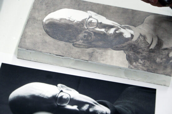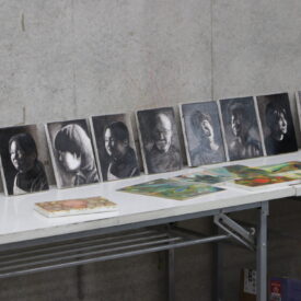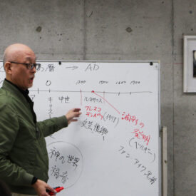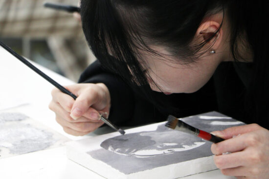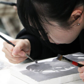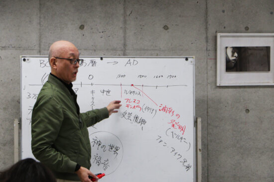1年生 専攻別テーマ制作(版画専攻・絵画専攻)鈴木吐志哉先生(木版)と工藤礼二郎先生(グリザイユ)による1年生「専攻別テーマ制作(版画専攻・絵画専攻)」の授業です。 ○絵画を学ぶ上で重要な西洋絵画。その中心をなす油彩画の支持体の変遷を学ぶと同時に、油彩画発祥の初期フランドル派の技法に基づくグリザイユ(モノトーンの絵画)を制作する。 ○油彩画の古典技法を通じて油絵材料の性質や支持体の重要性と絵画組成を理解する。