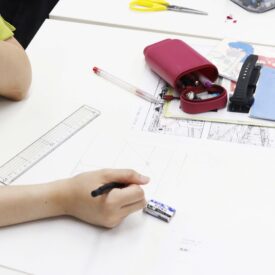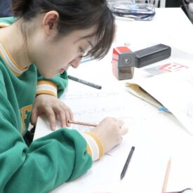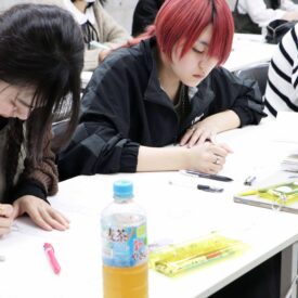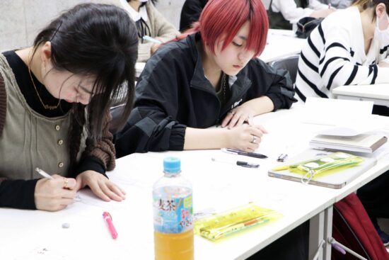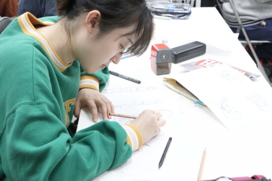 1年生 ビジュアルデザイン科「コミック基礎AⅠ」石山さやか先生による1年生ビジュアルデザイン科 『漫画』を描くための基礎練習、筋トレの授業です。基本的な人物の描き方、パースの引き方 と演出方法について。現代の漫画作品の発信方法やデビューまでの道筋、また制作の工程につ いても学びます。 |