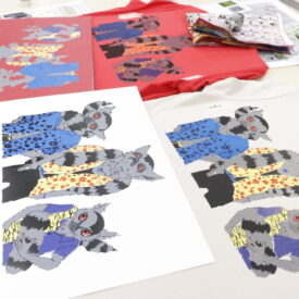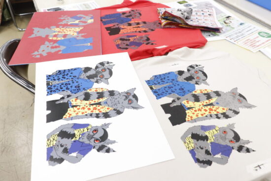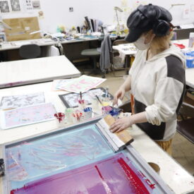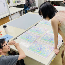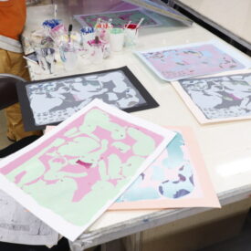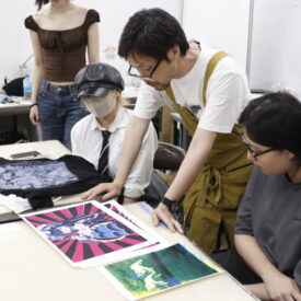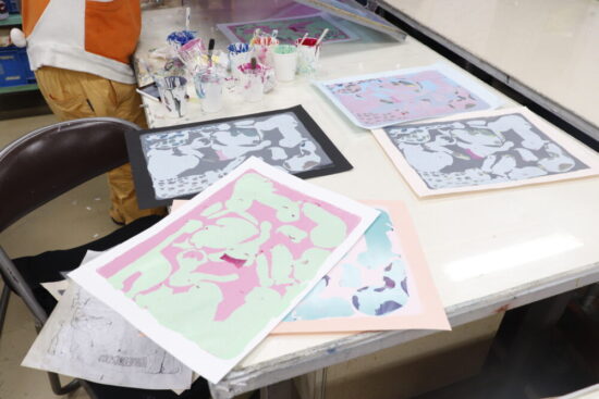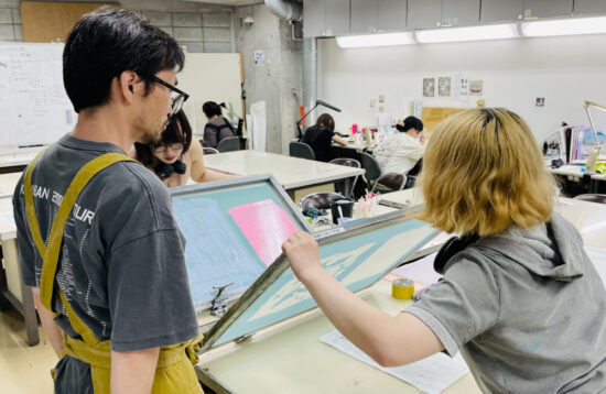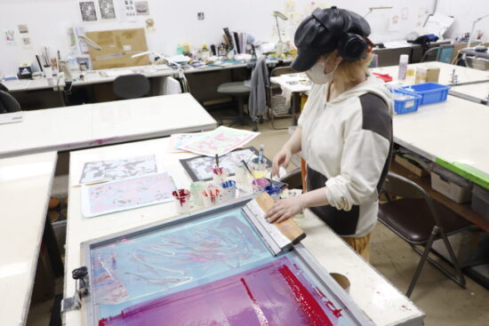 シルクスクリーン版画制作を通して孔版画の専門的知識を習得し、自己表現に結びつくよう学習します。 基本の直接製版方法を重ねて実習し、環境にやさしい水性インクを使用して刷紙に刷ります。PCを使用した4色分解による4版4色の作品を1点、5版以上を使った作品を1点制作し、色を刷り重ねる時の表現効果、用具資材の正しい使い方、手順を覚え多彩な効果を会得していきます。