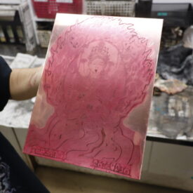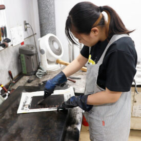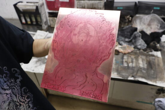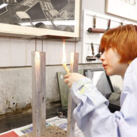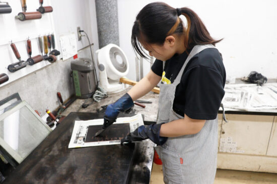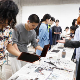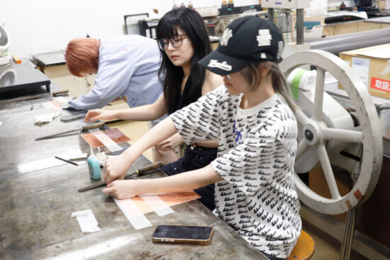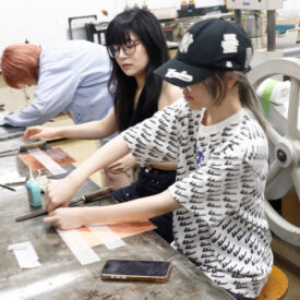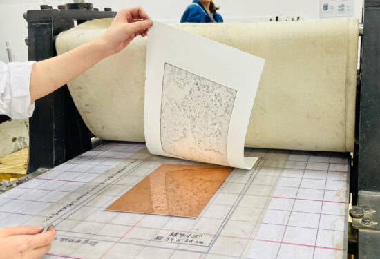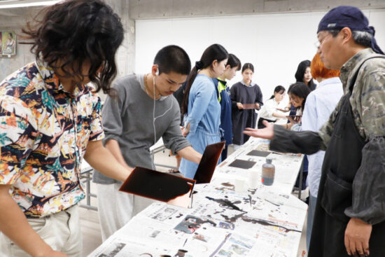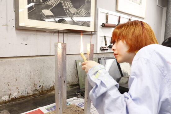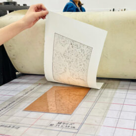 1年生 ファインアート科「銅版画1」長島充先生による1年生ファインアート科「銅版画1」の授業です。 腐食銅版画の中で最も基本的な技法であるライン・エッチング技法によりモノクロームの銅版画1点(18×24㎝)を制作します。ドローイングにも感覚の近い線描と点描を用いて自然物を観察し銅板という物質に表現していきます。 |