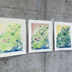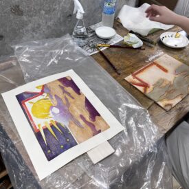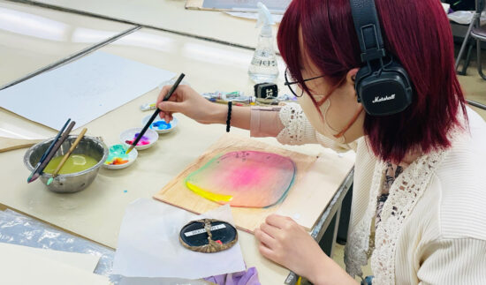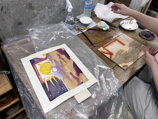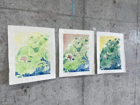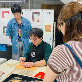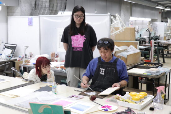 2年生 版画専攻 「木版画」鈴木吐志哉先生による2年生ファインアート科版画専攻「木版画」の授業です。 1年次に体験した油性木版画1版単色をこの授業ではさらに水性多色木版画に展開していくことで、木版画技法の充実と色彩について研究します。 水性多色木版画の技法は浮世絵に見られるように日本独自の進化を遂げた技法でもあります。古来からの技法と現代の技法を駆使して自由な発想で制作します。 |