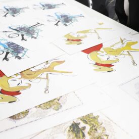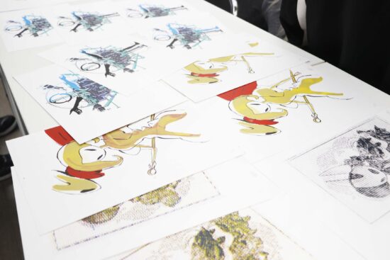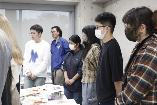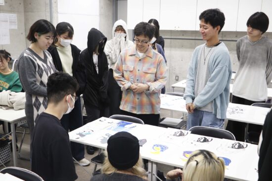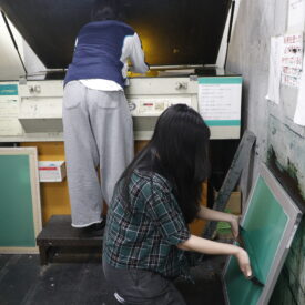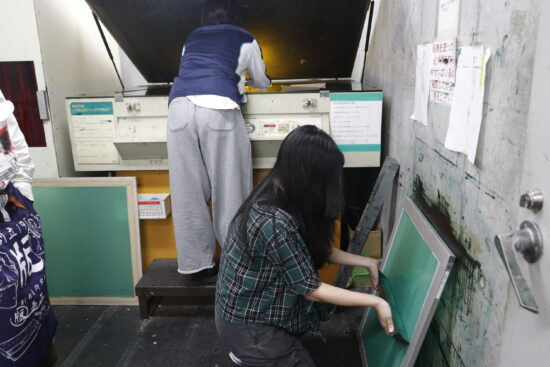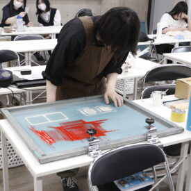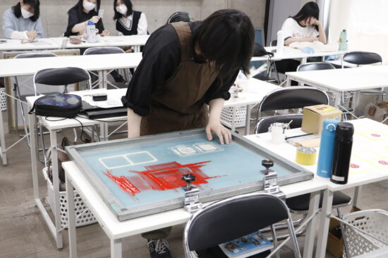 1年生ビジュアルデザイン科「シルクスクリーン基礎」東樋口徹先生による1年生ビジュアルデザイン科「シルクスクリーン基礎」の授業です。 基本的な水性インクで紙に刷る4版以上を使った作品(A4/21㎝×29.7㎝)を一点制作。 シルクスクリーンは別名孔版と呼ばれ、型染めの型紙と紗が組み合わされて改良されたものです。枠に張った紗の目を不必要な部分は塞ぎ、画の孔(穴)の部分からスキージによって下の紙にインクを落として刷る技法です。授業においてはいくつかの製版方法がありますが、現在一般的に行われる直接感光法を学びます。基礎を身に付け各自のイメージに近づける作品作りを目指します。 |