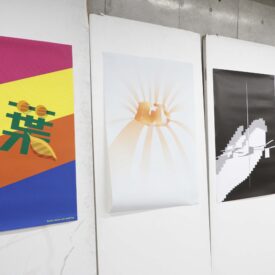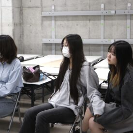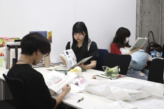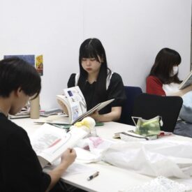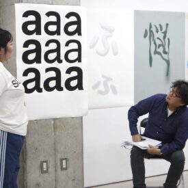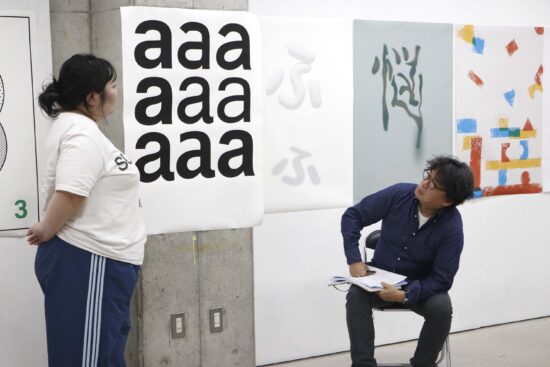 草谷隆文先生による2年生グラフィックデザイン専攻「ポスターデザイン」の授業です。 各自、漢字、カタカナ、ひらがな、アルファベットから好きな1文字選び、文字の持つディティールを研究しつつ、 ファインアートを取り込んだポスター作品を制作します。授業内でディスカッションをして制作を進めていきます。