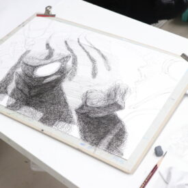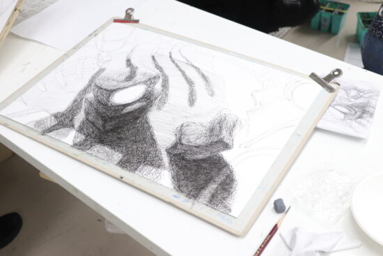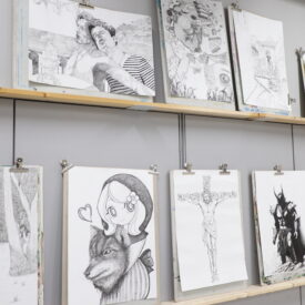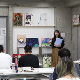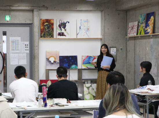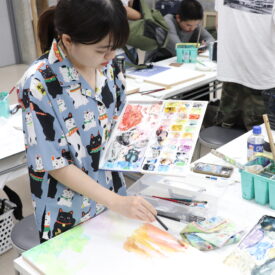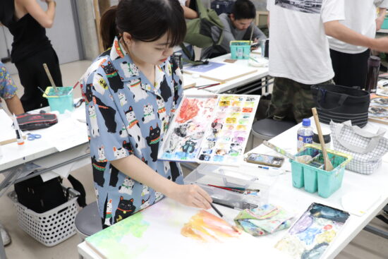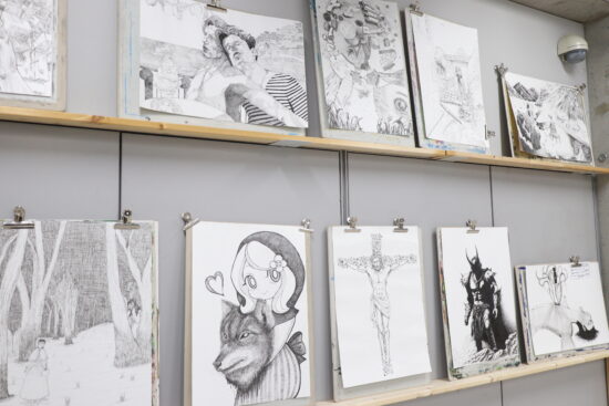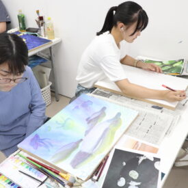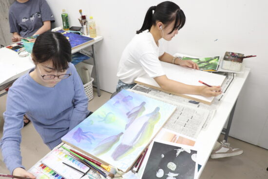 1年生 ファインアート科「テーマ制作」今野樹里恵先生による1年生ファインアート科「テーマ制作」の授業です。 テーマに基づくイラストレーション制作を修得します。一つの世界観で一連の作品を制作すること、自分の内面を表現するだけでなく外的要因(文学)に応じて制作をすることで、既存の表現に囚われずに新しい自分だけの表現を目指します。 文学にまつわる挿絵を連作(サイズに応じて3~5カット)で制作し、装丁や挿絵などで既存イメージができている文学を、自分だけの表現方法で再構成します。 |