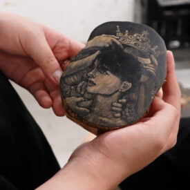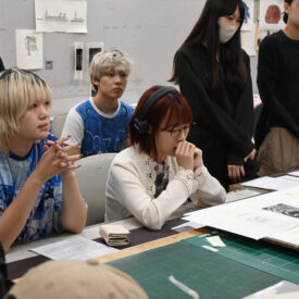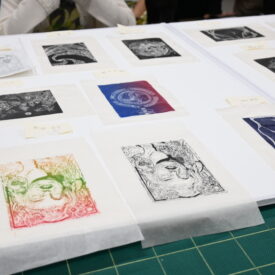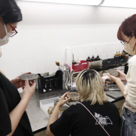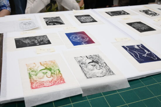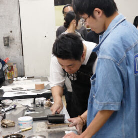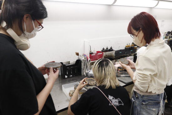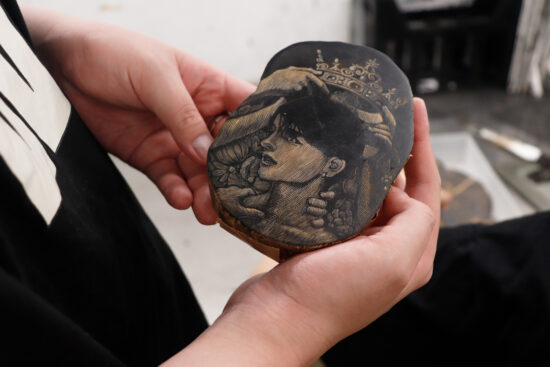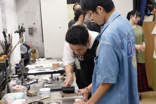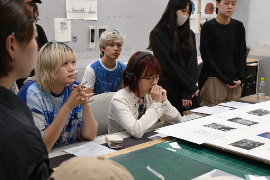 2年生 版画専攻 「木口木版画」長嶋一孝先生による2年生ファインアート科版画専攻「木口木版画」の授業です。 木口木版画は、18世紀頃ヨーロッパで完成された木版画の技法です。柘植、椿等の堅牢な木材の木口の面を、ビュランという彫刻刀で彫り進んでいく木口木版画の技法は、白と黒との精緻な表現に適しています。 本実習では、版画の技法の中でもとりわけ単純で明快な彫って摺るという行為に重点を置き、原初的な彫版の作業の中で自分自身の素直な表象と出会うことを目指します。 |