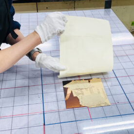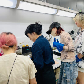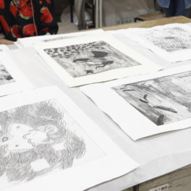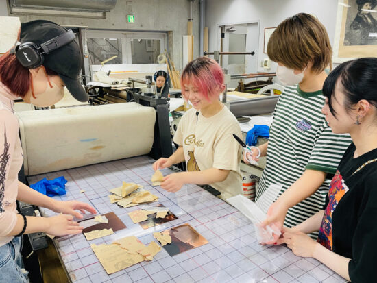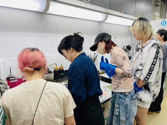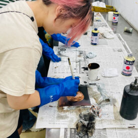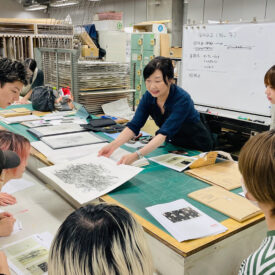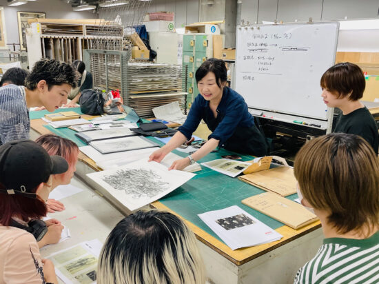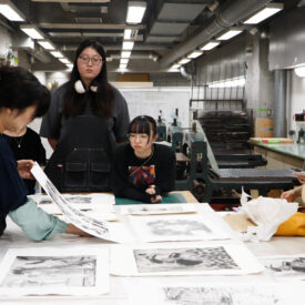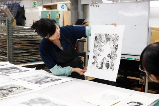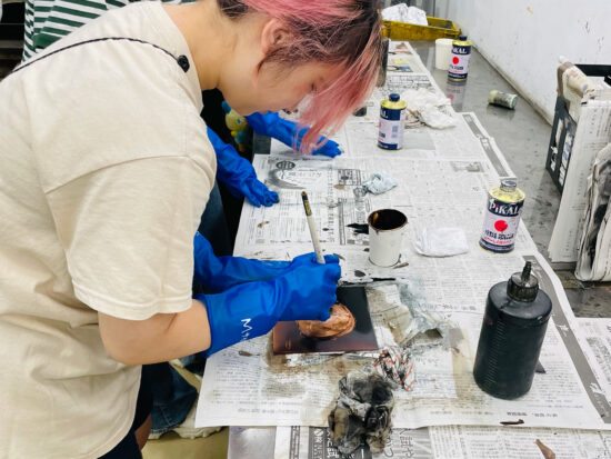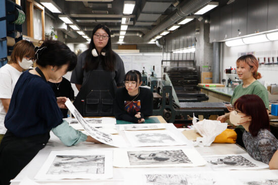 2年生 版画専攻 「銅版画」馬場知子先生による2年生ファインアート科版画専攻「銅版画」の授業です。 銅版画の制作プロセスを修得し、作品を完成させます。銅版画の腐食技法の多様な表現に触れ、その中で自らの表現に必要な技法を選択し計画的に作業を進めることを目指します。版を媒介することで生じる偶然性を柔軟に取り入れながら自分の表現の世界を広げていきます。 初めに小さい版をテストプレートとして、銅版画の様々なマチエール表現を試しながら「道具、薬品の使い方」「描画」「製版」「刷り」の制作プロセスの基本を理解し体得します。 |