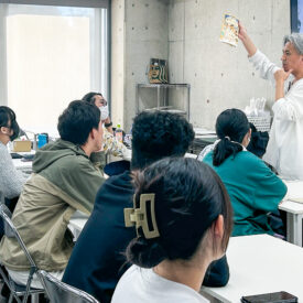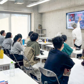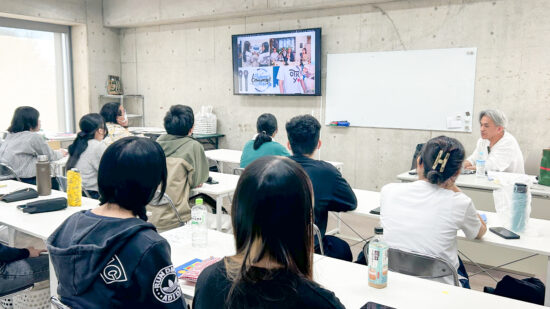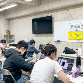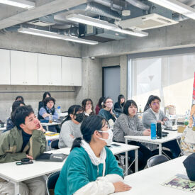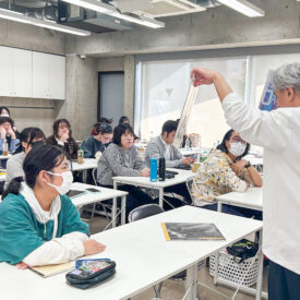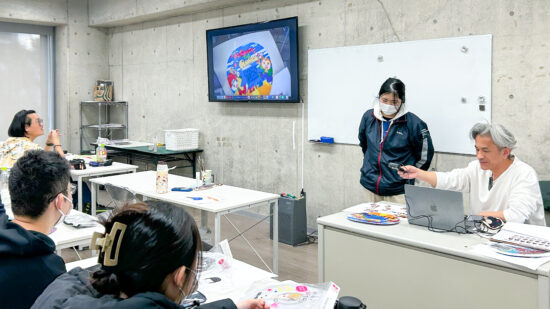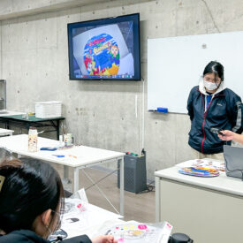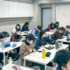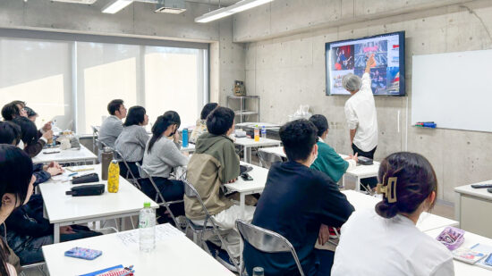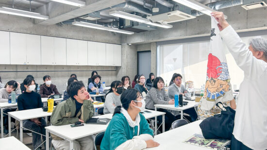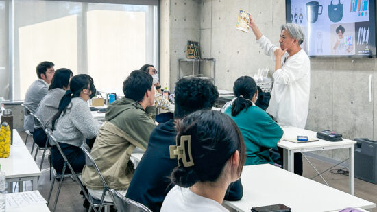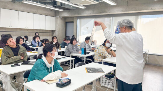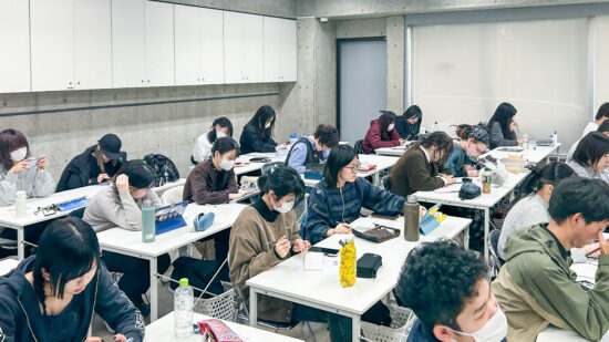 1年生 ビジュアルデザイン科「グッズデザイン制作」山田淳史先生による1年生ビジュアルデザイン科「グッズデザイン制作」の授業です。 ロゴ(ビジュアル)の制作から、実際にグッズへ展開するまでの一連の流れを体験します。各グッズの特性を理解し、色数や印刷方法などを考慮しながら、ロゴ(ビジュアル)をどのように展開していくかを学習します。 課題では、クライアントが参加する年末年始カウントダウンフェスを想定し、グッズデザインを制作します。学生自身が対象となるクライアントを設定し、フェス会場で「売れる」ことを意識したデザインを考え、制作を通して、実践的なデザイン力と企画力を身につけます。 |