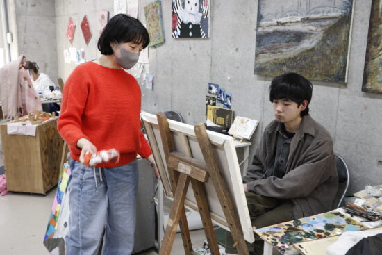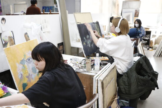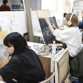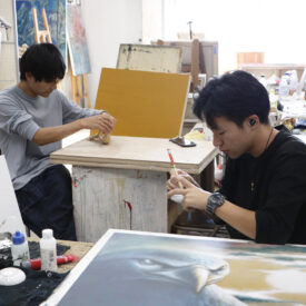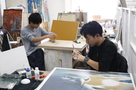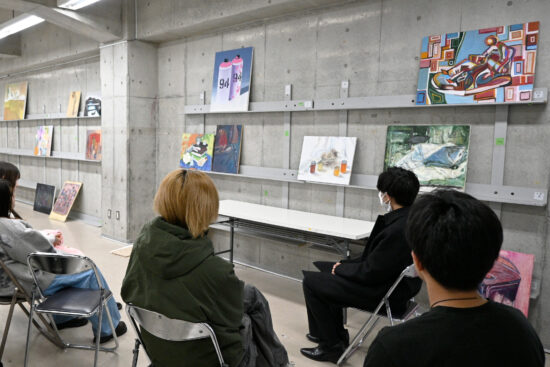 2年生絵画専攻「絵画と物語」山口藍先生、工藤礼二郎先生による2年生ファインアート科絵画専攻「絵画と物語」の授業です。 描こうとする題材(テーマ)を任意の物語や散文などの一場面に設定し、それを絵画作品として表現するために最も適した支持体を選び(あるいは作り)制作します。 |