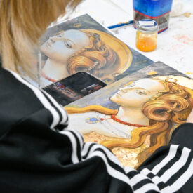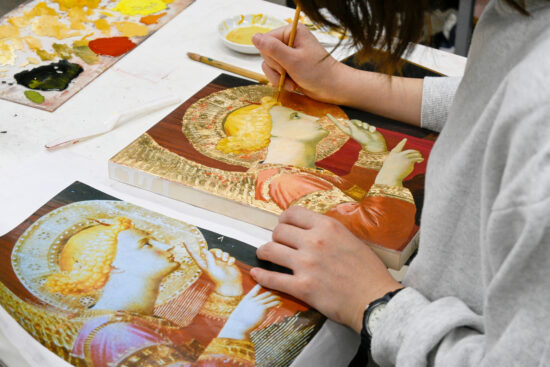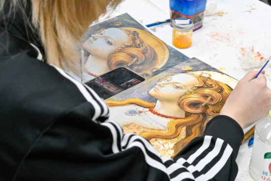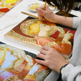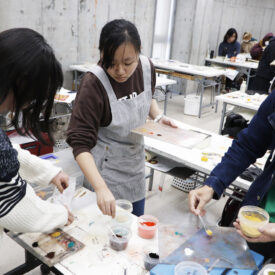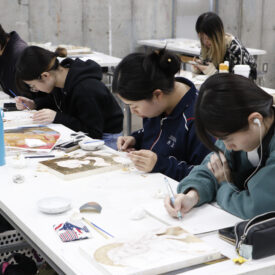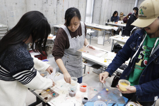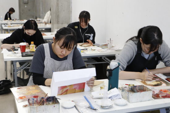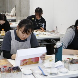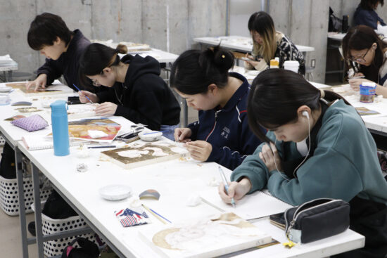 1年生ファインアート科「テンペラ画」熊谷宗一先生による1年生ファインアート科「テンペラ画」の授業です。 中世美術からルネッサンス期を経て現代にまで受け継がれてきた卵テンペラ技法を学びます。また卵で作る絵具の造形の自由さ、楽しさも学びます。 |