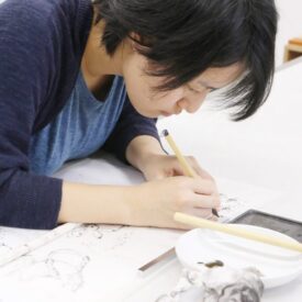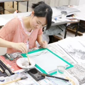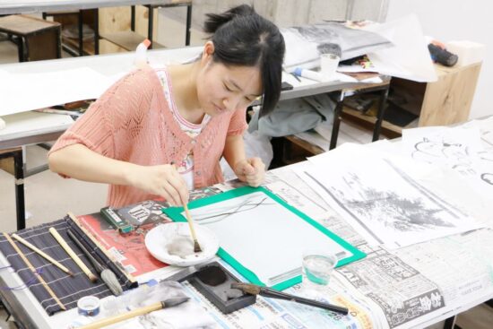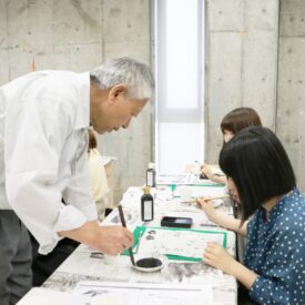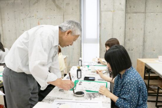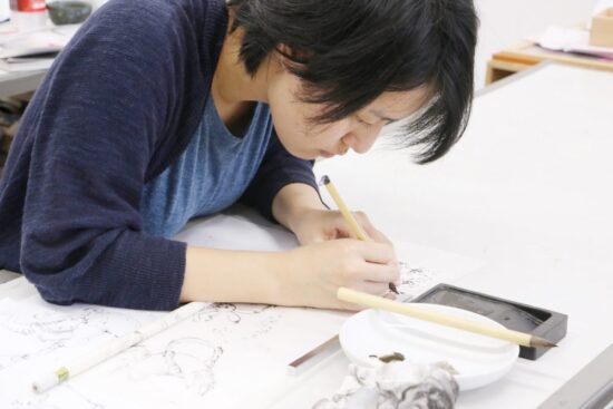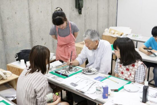 墨による線描の学習、付け立て・日本画の模写(鳥獣戯画)を教わります。
