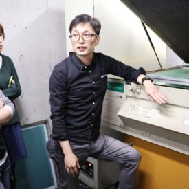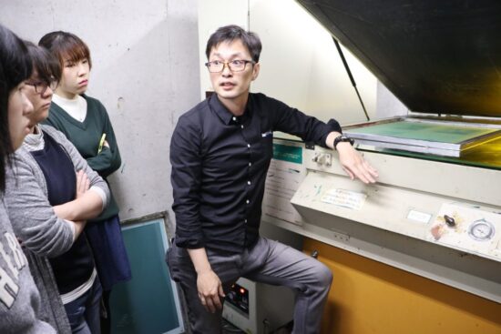 1年生の東樋口 徹先生による「シルクスクリーン」の授業です。 基本的な水性インクで紙に刷る4版以上を使った作品(A3/29.7㎝×42㎝)を一点(紙8枚程度)制作します。 基礎を身に付け各自のイメージに近づける作品作りを目指します。