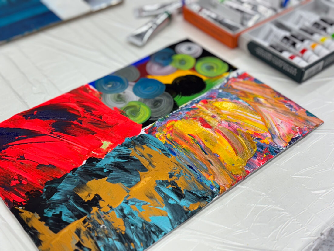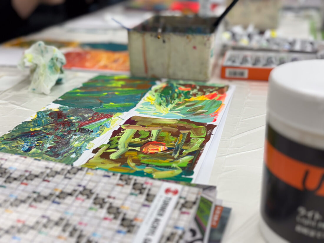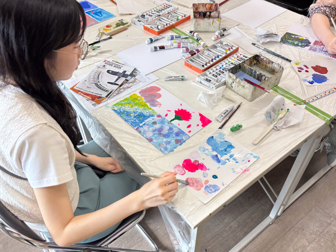 アクリル・水彩・油彩の違いをプロから直接学び、その後はアクリル絵の具を実際に使って制作体験。