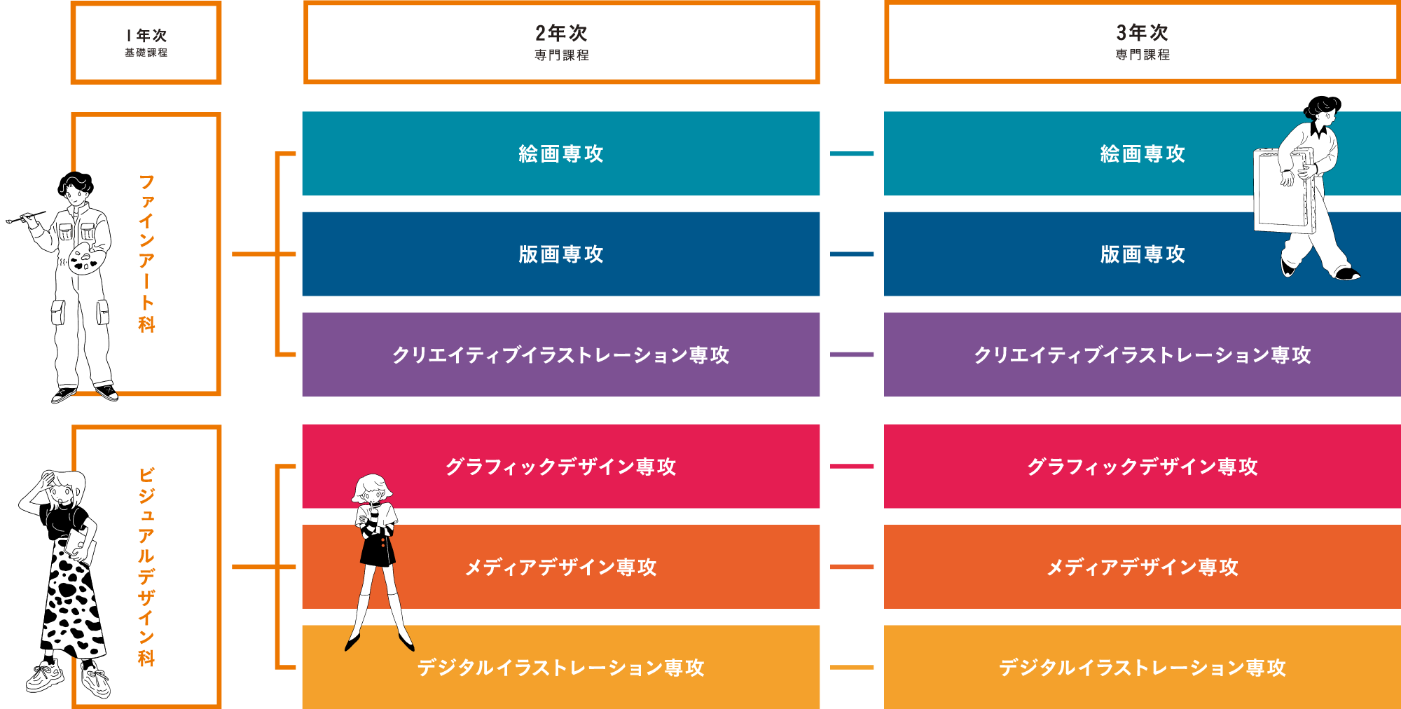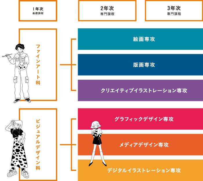 - 各科じっくり基本を学びながら自分に合った専攻を見つけていきます。2年次からはより専門性の高い技術と知識を学び、プロの現場で必要とされる実践的な応用力を深めてゆきます。