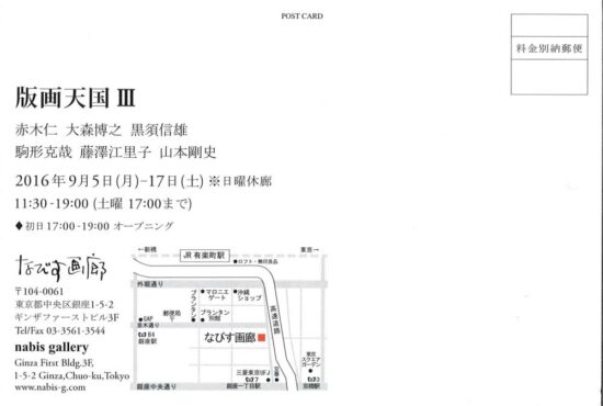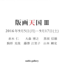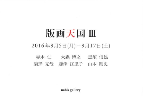 山本剛史(版画科20期 卒業) 日時:2016年9月5日(月)〜9月17日(土) 11:30〜19:00(土曜17:00まで) ※初日17:00〜19:00 オープニング ※日曜休廊 会場:なびす画廊 http://www.nabis-g.com/