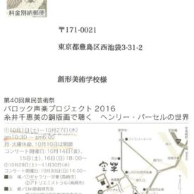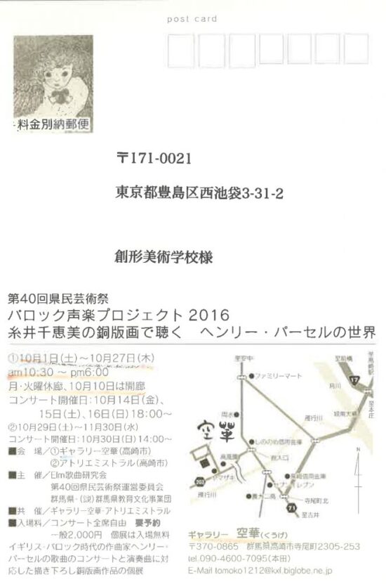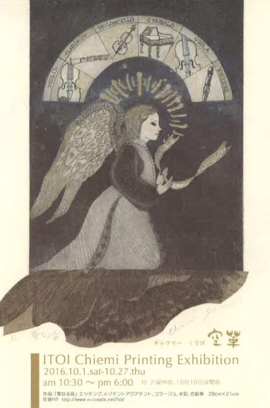 ITOI Chiemi Printing Exhibitionー 糸井千恵美の銅版画で聴くヘンリーパーセルの世界 ー 糸井千恵美(版画専攻16期 卒業) 日時:2016年10月1日(土)〜10月27日(木) 会場:ギャラリー空華 |
